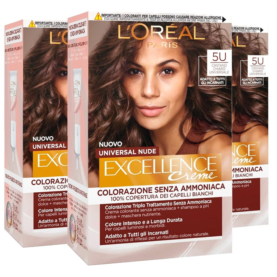 3 x L'Oréal Paris Excellence Creme, permanente Haarfarbe, Universal Nude, Hellbraun 5U, Dreifachbeha