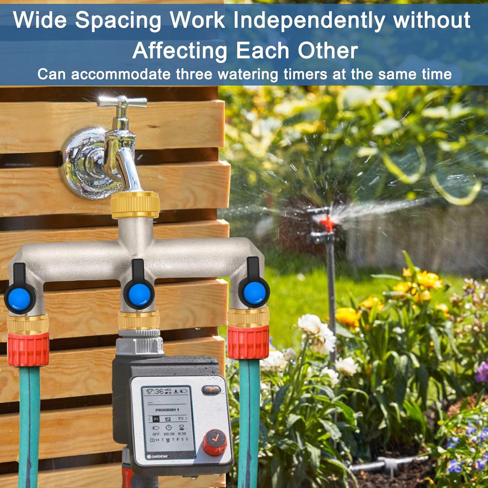 3-Wege Wasserhahn Wasserverteiler aus Messing für 3 Geräte/Gartenschläuche, 3er Verteiler 3/4" Adapt
