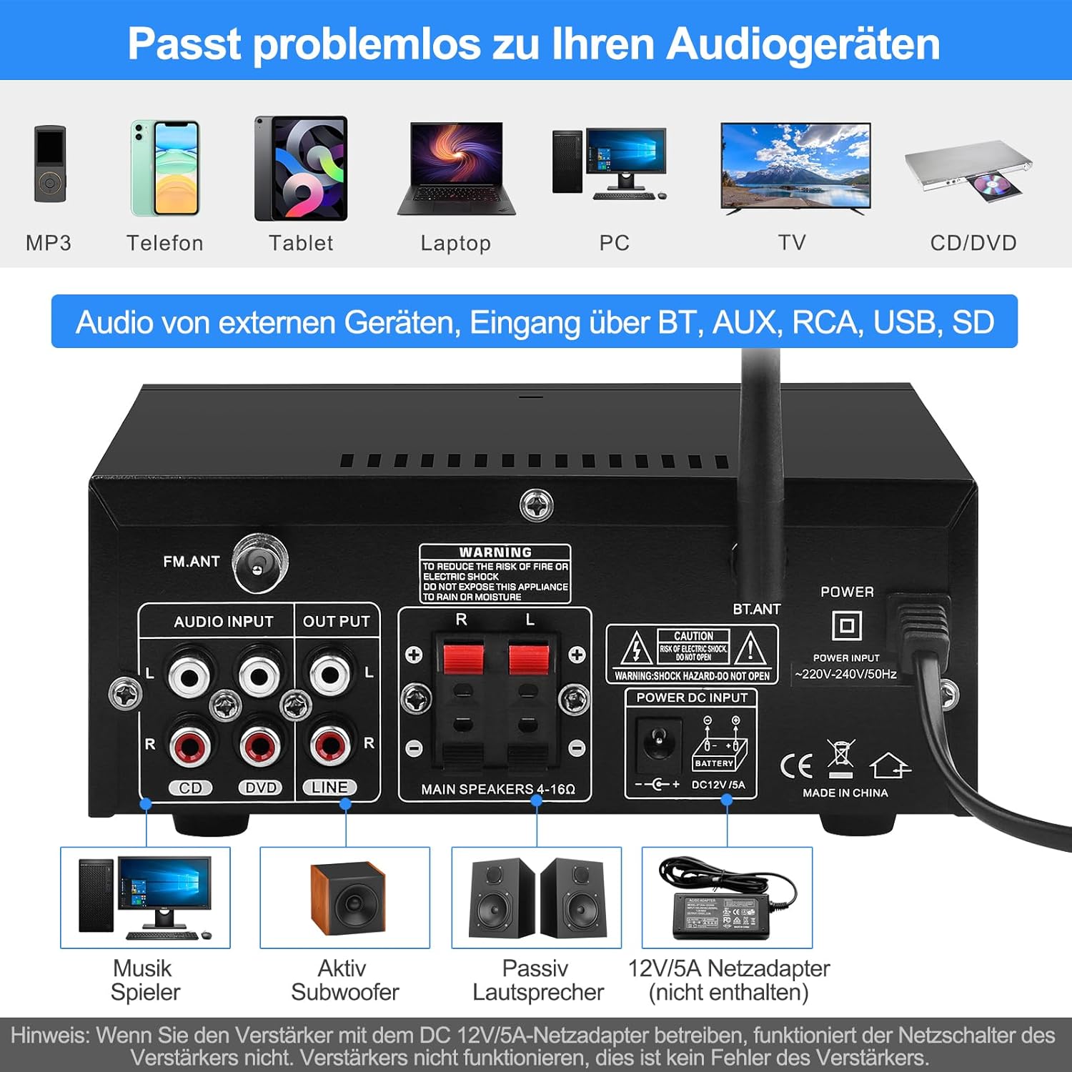 - Mehrfacher Eingang, breite Anwendungen: KS-33BT HiFi-Verstärker-Empfänger mit SD, USB, AUX und MIC-Eingang, RCA kabelgebundene Verbindung Eingänge und Bluetooth drahtlose Verbindung Eingänge, Audio-Quelle Eingang von Telefonen, Computern, TVs,