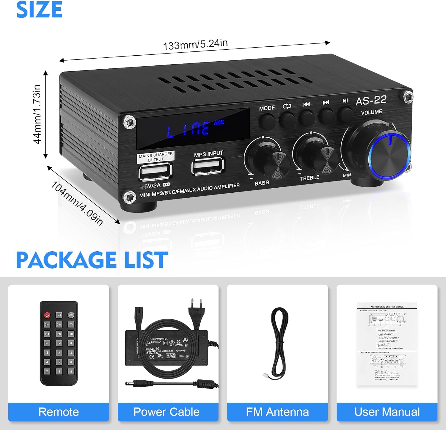 - 【BLUETOOTH WIRELESS CONNECTION】Dieser AS-22 Mini-Audio-Verstärker verfügt über ein eingebautes Bluetooth, das die drahtlose Verbindung zwischen Audiogeräten und dem Verstärker unterstützt, Audioübertragung ohne Verlust der Klangqualität,