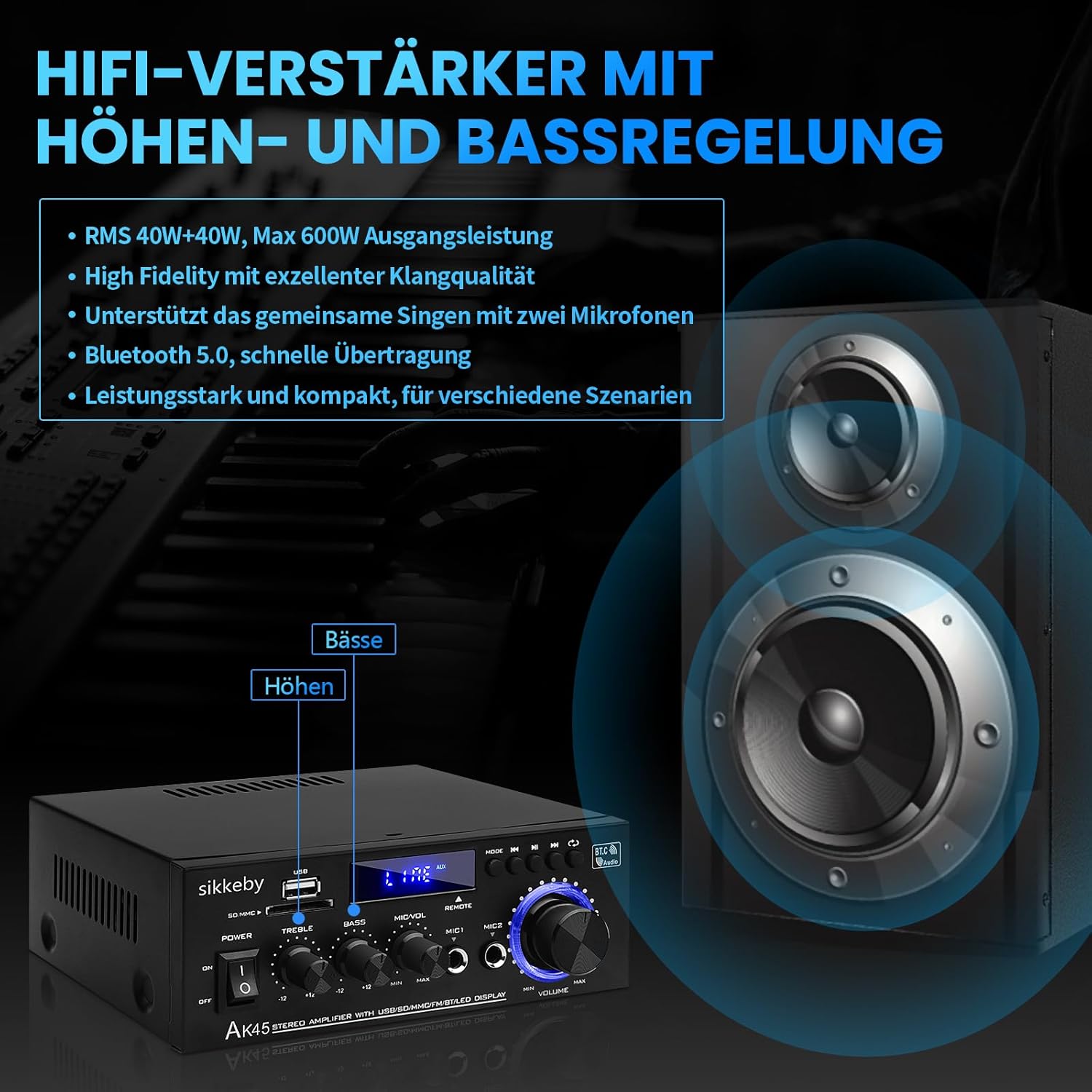 - Upgrade Version AK-45 Digital Audio Amplifier: Vollständig aktualisiertes Design, 40W+40W Nennleistung, perfekt geeignet für 4-8 Zoll Passivlautsprecher. Funktionserweiterung, Hinzufügen einer Mikrofonbuchse. Ausserdem ist die Klangqualität als