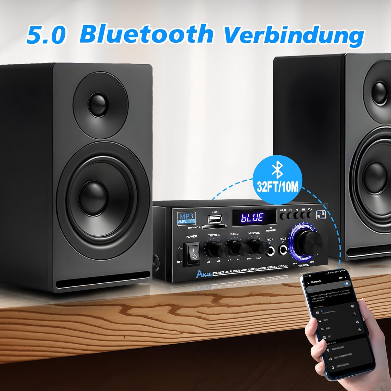 - 【Multiple Input & Multipurpose】 AK45Stereo-Verstärker, mit Bluetooth, AUX, MIC, USB-Eingang, Audio von externen Geräten, wie CD, DVD, TV, PC, Computer, Tablets, Notebooks, Telefone, MP3, und Projektoren mit AV-Audio usw., Empfohlen für