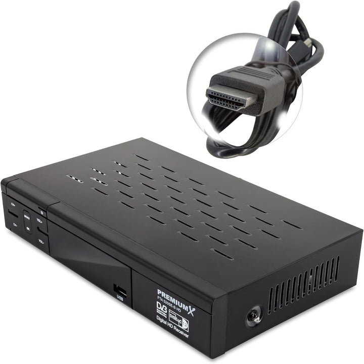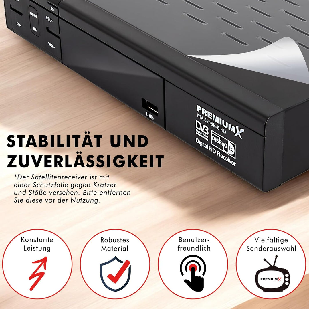 - Lieferumfang > Digitaler Satellitenreciver, Bedienungsanleitung auf Deutsch, Fernbedienung mit Batterien, HDMI-Kabel für beste Bild- und Tonqualität