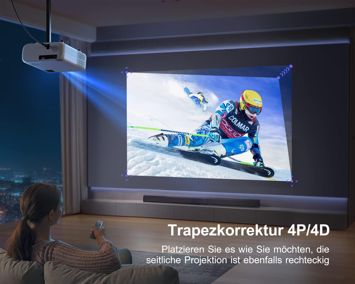 - 🛒【4D/4P Double Trapezkorrektur & -50% Zoom】Der Heimkino Beamer ist nicht nur mit einer 4D Trapezkorrektur, sondern übernimmt auch eine fortschrittliche 4-Punkt Trapezkorrektur. Sie können ein Rechteckiges Bild erhalten, indem Sie die vertikale und horizontale (±50°), oder indem Sie den Winkel der vier Ecken anpassen. Mit der Zoomfunktion kann die Bildgrösse mit der Fernbedienung auf 50% verkleinert werden, ohne dass der LED Beamer bewegt werden muss. Der empfohlene Projektionsabstand beträgt 3.2M
