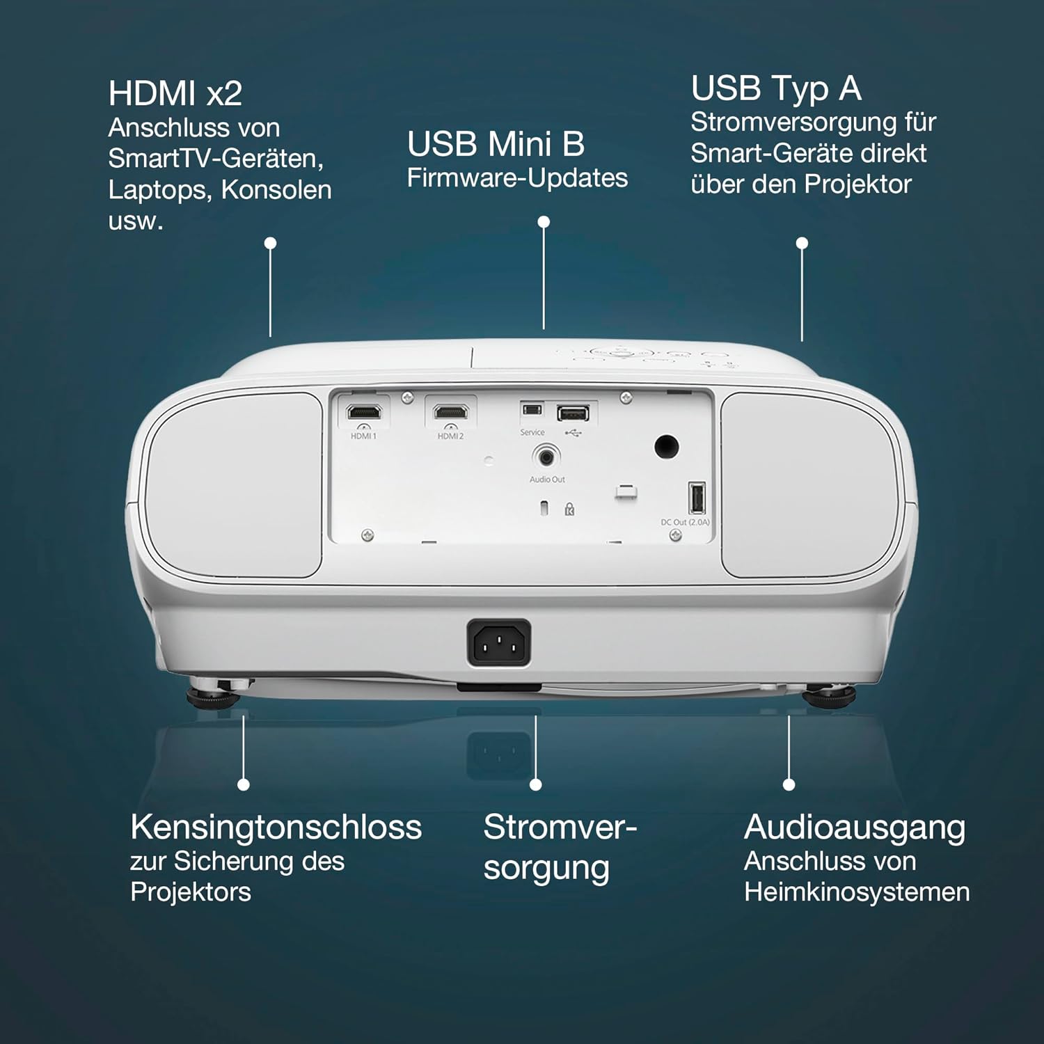 - Plug-and-Play, schliessen Sie einfach ein Streaming-Gerät an die Rückseite des Projektors an, Verbindung mit Soundbars über Bluetooth