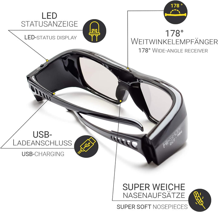 - ✅ Akku mit höchster Ladekapazität. Mindestens 60 Stunden im Dauerbetrieb mit nur einer Akkuladung. LED Indikator zeigt den aktuellen Ladestatus an. Intelligente Schaltkreise schalten die Brille nach 5 Minuten aus, wenn diese nicht verwendet wird.