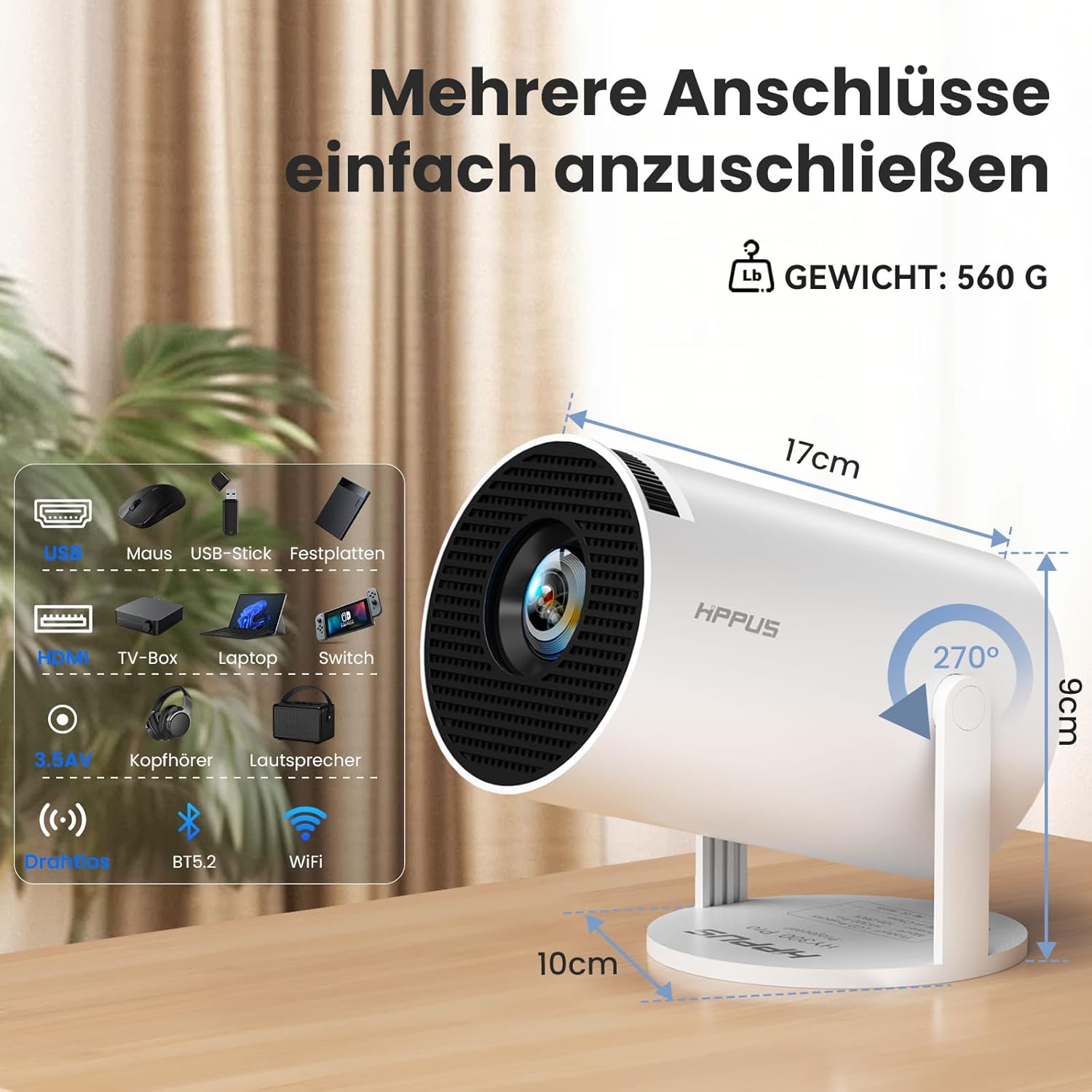 - 【Kabelgebundene und drahtlose Konnektivität】: HIPPUS Mini Beamer lässt sich dank seiner vielseitigen Anschlussmöglichkeiten wie HDMI, USB, WLAN und Bluetooth mit verschiedenen Geräten verbinden – für den geschäftlichen oder privaten Gebrauch.