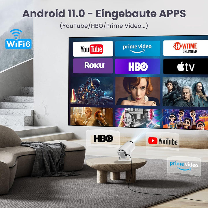 - 【Android TV 11.0】: Das aktualisierte Android TV 11.0 versorgen den All-in-One-Projektor mit über 4000 Apps, einschliesslich beliebter Apps wie Netflix, YouTube und Hulu mehr. Sie können die Fussball-WM live im Fernsehen verfolgen, indem Sie die