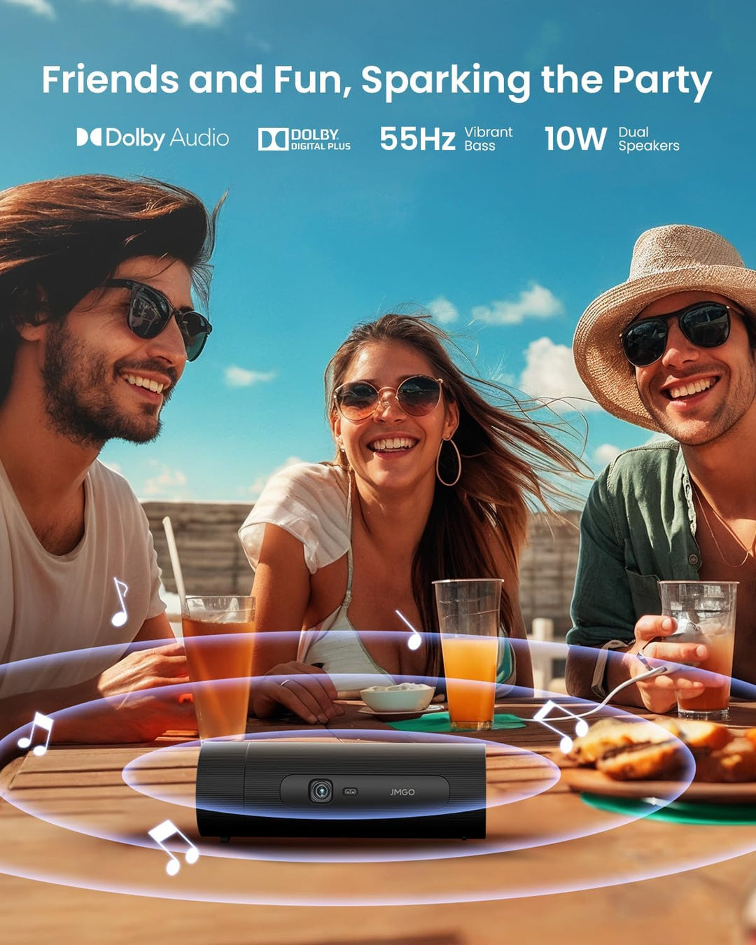 - Lebendiges Audio: Erleben Sie immersiven 3D Sound mit 10W Lautsprechern und Dolby Digital Plus beim kompakten JMGO mini projektor handy für Aussenbereich. Tiefe Bässe und klare Höhen sorgen für einen raffinierten, dynamischen Klang, ideal für