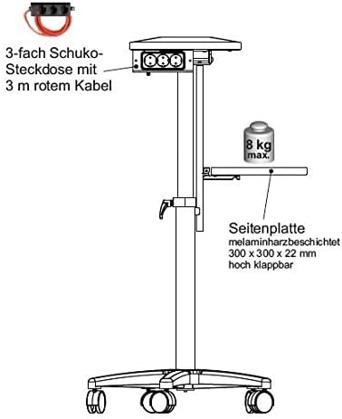 - Inklusiver 3-fach Schuko-Steckdose (GS, VDE) und drei Meter langem rotem Kabel, ein Rednerpult auf Rollen für den perfekten Auftritt.