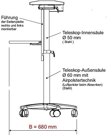 - Der Beamer Tisch ist von 73,5 (Sitzhöhe) bis 120 cm stufenlos höhenverstellbarer und passt sich der Grösse des Vortragenden perfekt an. Durch die Airpolster-Technik ist ein sanftes Ablassen des Stehtisch möglich, ein überraschendes Durchsacken der