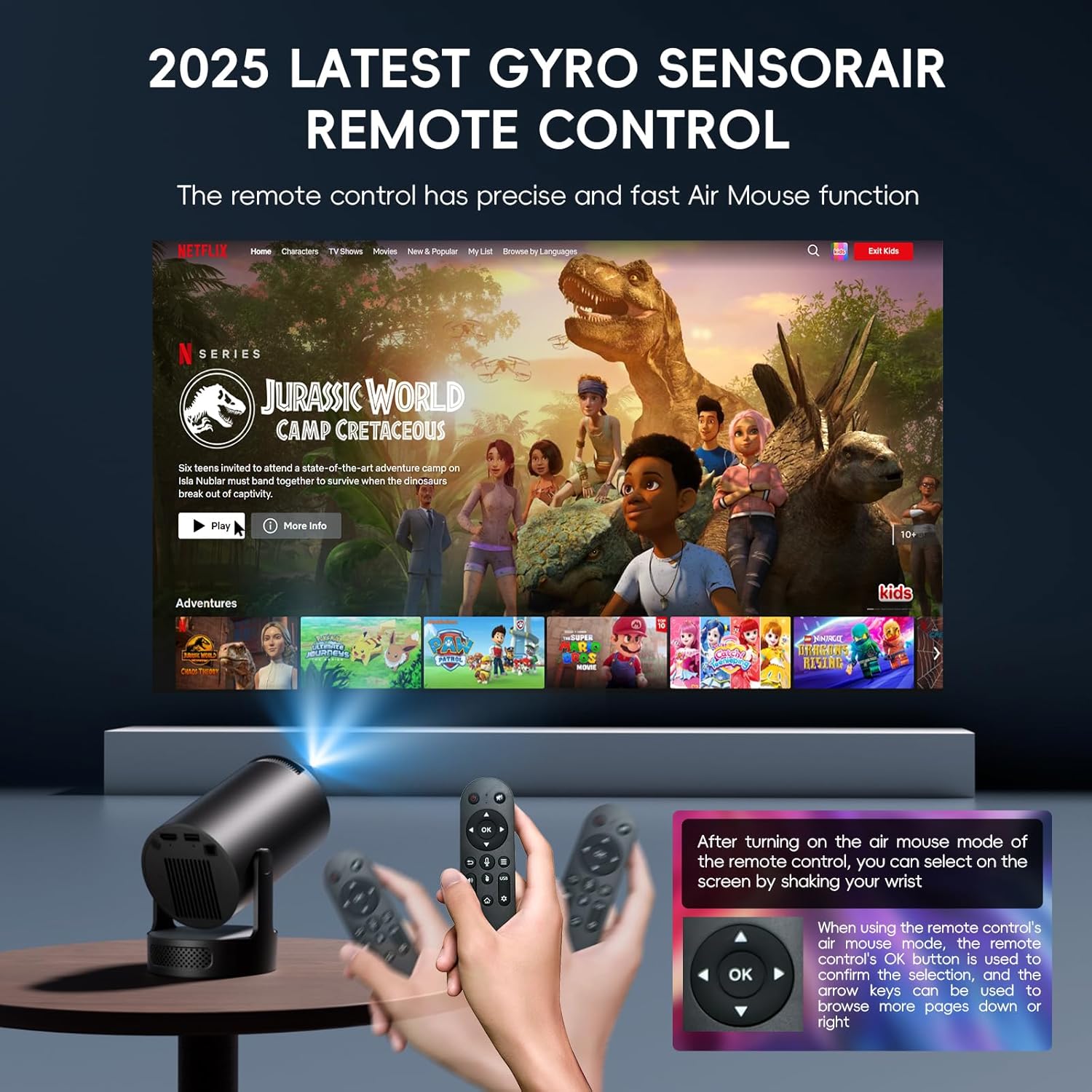 - [Mini Beamer mit Air Remote-Funktion & integrierten Apps] Die Fernbedienung des tragbaren Beamer Wowlink W210 verfügt über die Air Remote-Funktion, die auf der Gyroskop-Technologie basiert. Sie können den Projektorbildschirm steuern, indem Sie einfach