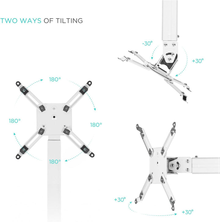 - NEIGUNGSVERSTELLUNG IN ZWEI EBENEN: Die horizontale und vertikale Neigungseinstellung von -20° bis +20° ermöglicht es Ihnen, die Position des Projektors unabhängig von der Montageposition der Halterung einzustellen