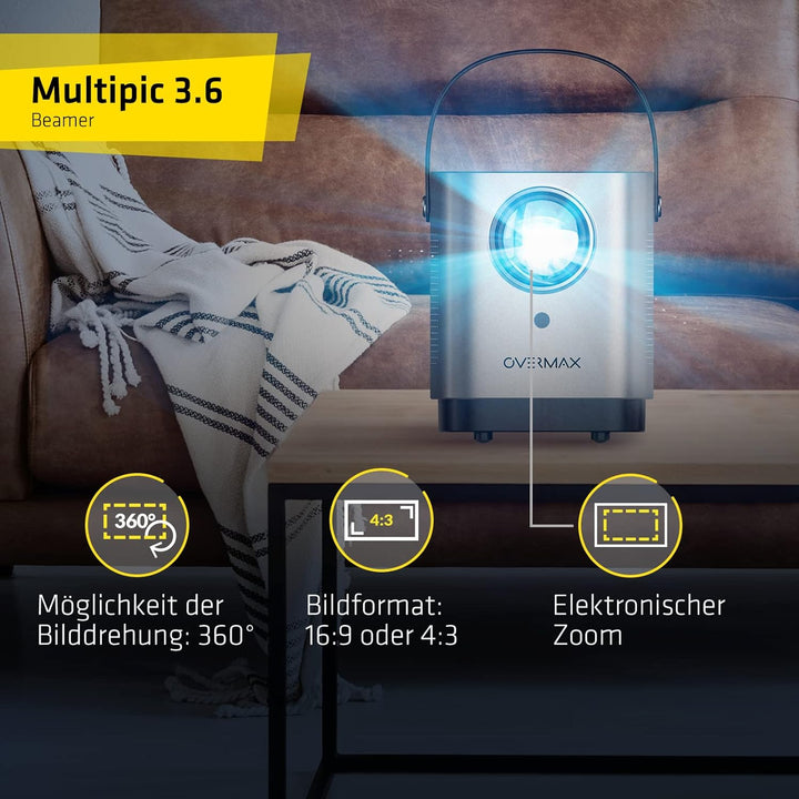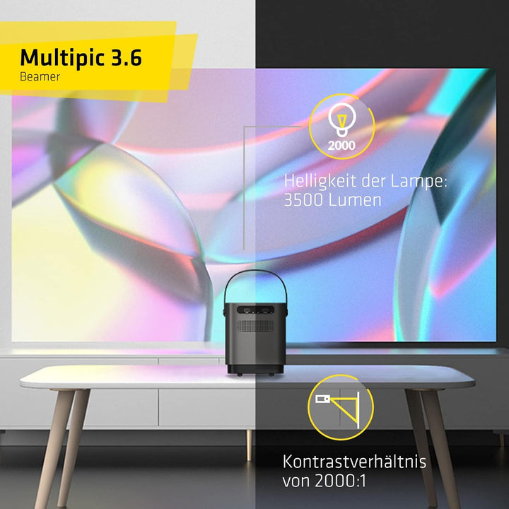 - MULTIPIC 3.6: Leichter Projektor mit praktischem Tragegriff. Das ideale Gerät für jede Situation. Hohe Bildqualität und HD-Auflösung für Projektionen von 35 bis 150 Zoll