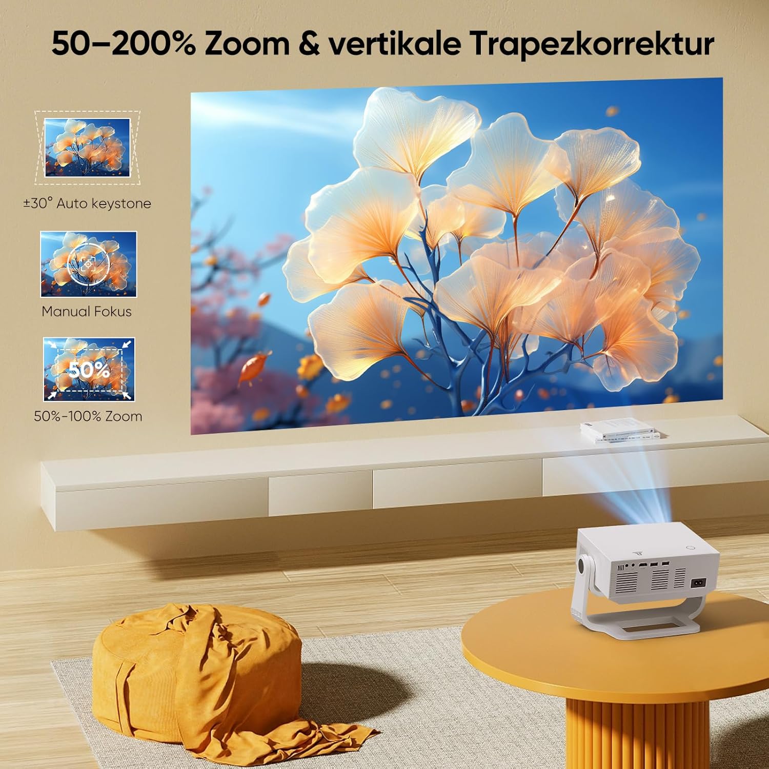 - Intelligente Bildkorrektur: Dieser Heimkino Beamer unterstützt Trapezkorrektur und Autofokus. Nach dem Einschalten oder Bewegen des Geräts kann durch einfache Anpassungen ein klares, rechtwinkliges Bild projiziert werden. Der Benutzer kann auch mit der