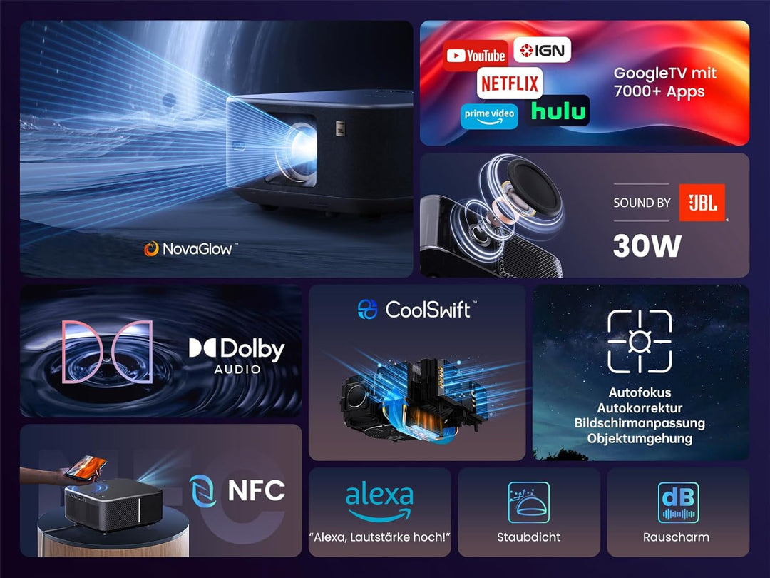 - 【Intelligente Sprachsteuerung】Dank Alexa und Hey Google! Koppeln Sie den Beamer kabellos mit Alexa und geniessen Sie freihändige Bedienung – Sie befehlen dem Beamer ganz einfach, Inhalte abzuspielen, Einstellungen zu ändern oder Ihre