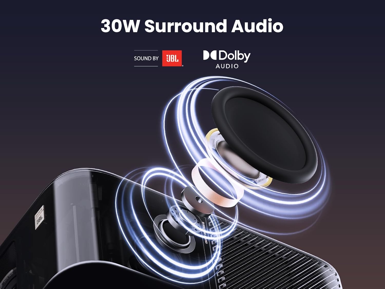 - 【30W JBL-Surround-Sound und Dolby-Audio】Der LED-Beamer verfügt über ein leistungsstarkes Audiosystem mit zwei 15W JBL-Lautsprechern und Dolby-Audio, das ein immersives Kinoerlebnis bietet. Dank der speziell für den K3 Heimkino-Beamer entwickelten