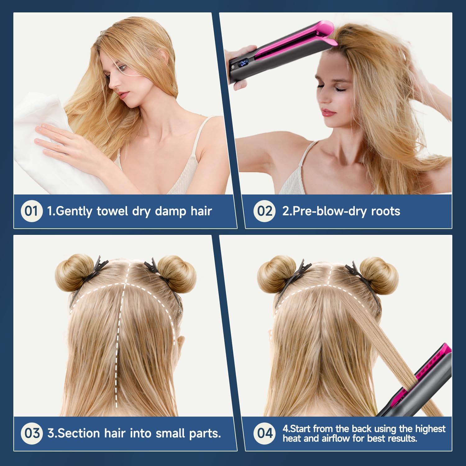 - 【Tipp für beste Ergebnisse】Beginnen Sie damit, den oberen Teil der Haare zu föhnen, und gleiten Sie anschliessend mit diesem Glätteisen durch den Rest, um alles glatt zu stylen.(Geben Sie nicht zu viel Haar auf einmal hinein und gleiten Sie das