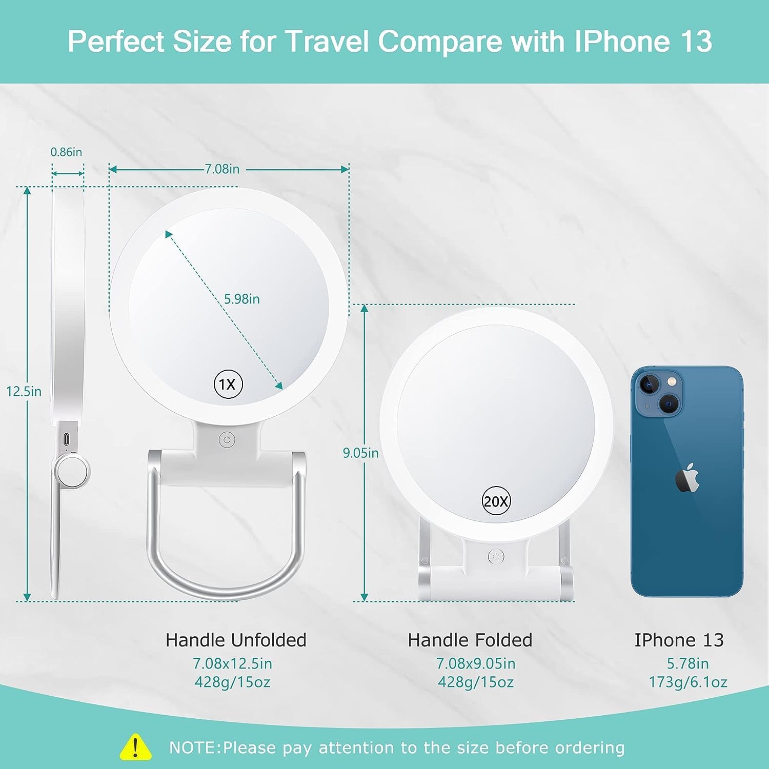 - 【Tragbar und einfach zu bedienen】Dieser Kosmetikspiegel mit Licht verfügt über einen schlanken, verstellbaren Klappgriff für die einfache Verwendung auf dem Tisch. Nehmen Sie diesen Vergrösserungsspiegel mit Licht mit auf Reisen oder verwenden