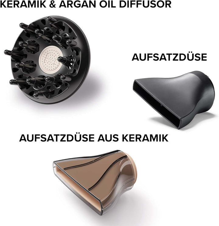 - Keramiktechnologie und Arganöl: Die gute Wärme, die das Haar respektiert und schützt, wird durch den Luftstrom erzeugt, der mit den drei Keramikkomponenten des Haartrockners in Kontakt kommt; Keramik gibt von Natur aus beim Erhitzen gute