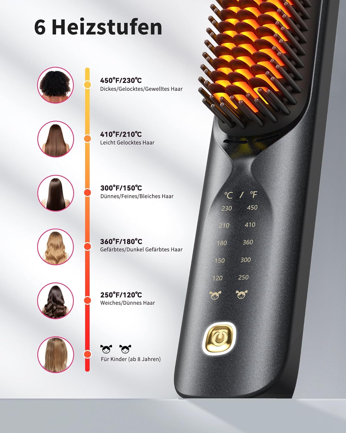 - ✨ 6 einstellbare Temperaturen: Wählen Sie präzise die ideale Temperatur für Ihren Haartyp – von feinem Kinderhaar (Kindersektion) bis zu dickem, widerspenstigem Wellen-/Lockenhaar (230°C). Reise glättbürste mit integrierte