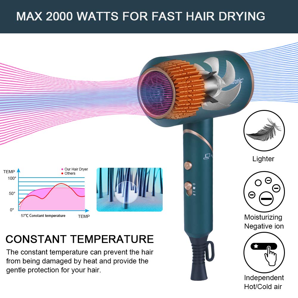 - 💚【2000W LEISTUNG & NIEDRIGES GERÄUSCH】: Der leistungsstarke Gleichstrommotor mit maximal 2000 W ist ausgestattet und liegt damit über dem durchschnittlichen Marktniveau des gleichen Haartrockners (mit Ionentechnologie). Das eingebaute