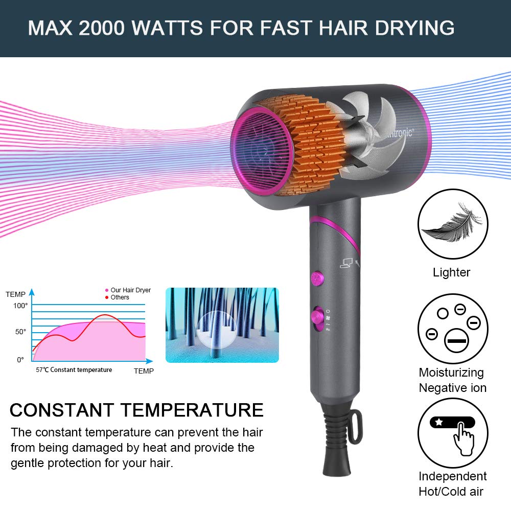 - 💜【2000W LEISTUNG & NIEDRIGES GERÄUSCH】: Der leistungsstarke Gleichstrom motor mit maximal 2000 W ist ausgestattet und liegt damit über dem durchschnittlichen Marktniveau des gleichen Haartrockners (mit Ionentechnologie). Das eingebaute