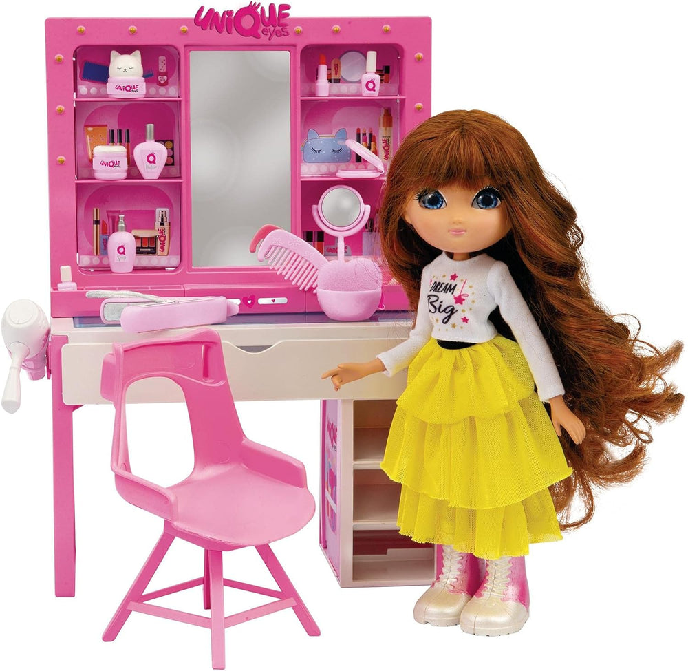 - Enthält zudem einen Schminktisch mit Schubladen und eingebautem Spiegel sowie einen passenden Stuhl für die Puppe