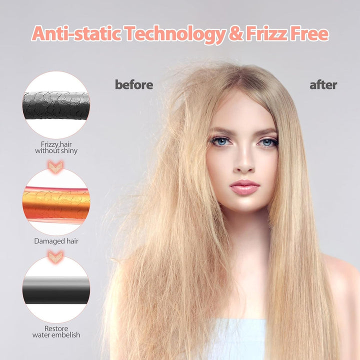 - Keramische Beschichtungsplatte: Die schwarze Keramik-Turmalin-Heizplatte erzeugt negative Ionen, um geöffnete Haarkutikula zu glätten, die natürlichen Öle und die Feuchtigkeit des Haares einzuschliessen, Kräuselungen zu reduzieren und Schäden am