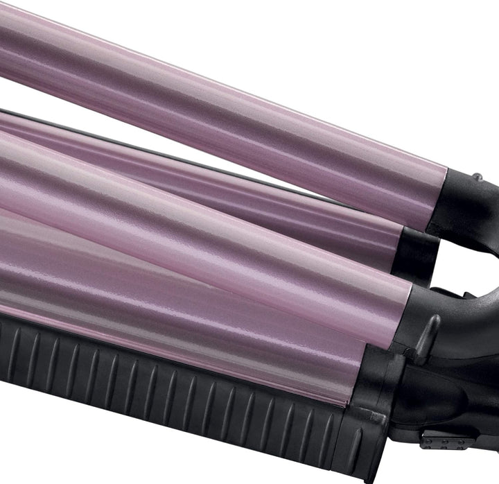 - Den doppelten Lockenstab entriegeln, mithilfe der beiden seitlichen Druckknöpfe drehen und den gewünschten Effekt wählen: Breite Seite für grosse Wellen mit weichem und natürlichem Effekt. schmale Seite für kleine und definierte Wellen für einen