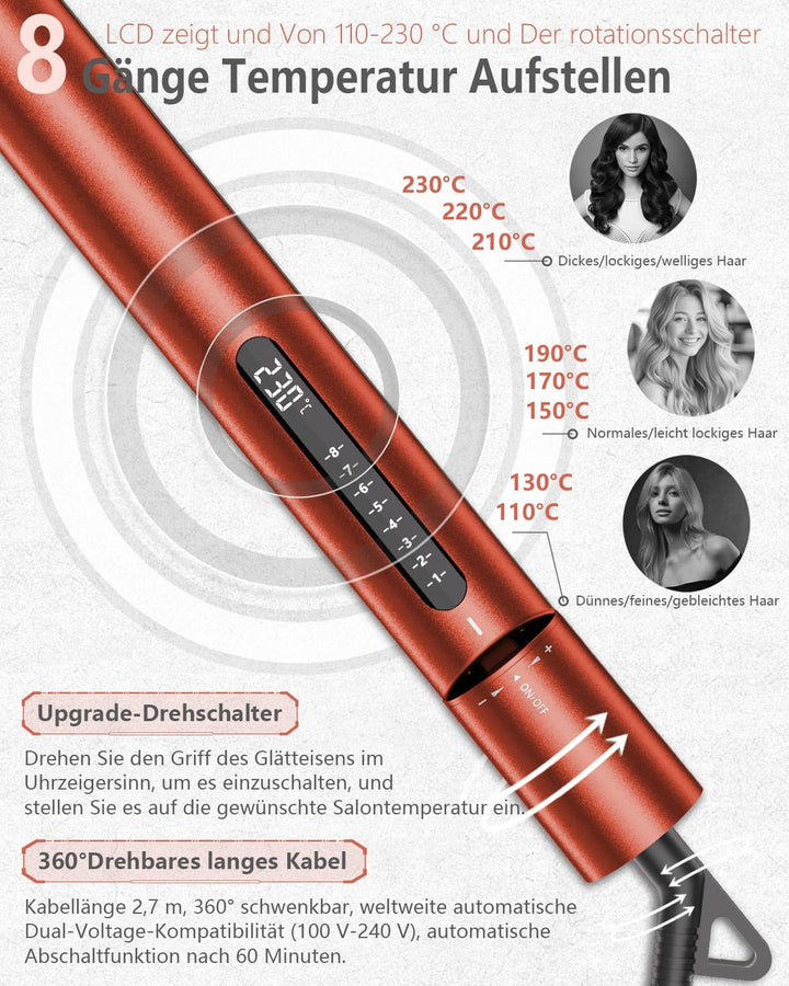 - Verbesserter Drehschalter und LDC 110-230 °C einstellbar: Drehen Sie den Eisengriff in einem Schritt ohne Tasten im Uhrzeigersinn, um das Gerät einzuschalten und auf Ihre bevorzugte Salontemperatur zu drehen. Digitales LCD-Display 8 präzise