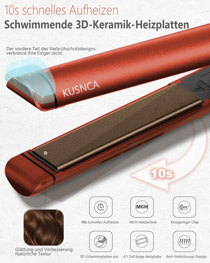 - Zeitsparender Verbrühungsschutz: Glätteisen mit fortschrittlicher MCH-Heiztechnologie und einer einzigartigen C-Sensor-Funktion (automatische Temperaturkalibrierung) ist der KUSNCA Flat Head Haarglätter mit einer 4,1 Zoll langen Heizplatte