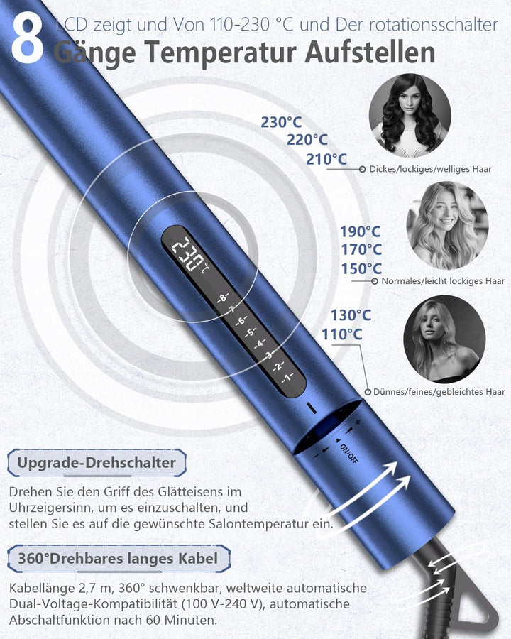- Verbesserter Drehschalter und LDC 110-230 °C einstellbar: Drehen Sie den Eisengriff in einem Schritt ohne Tasten im Uhrzeigersinn, um das Gerät einzuschalten und auf Ihre bevorzugte Salontemperatur zu drehen. Digitales LCD-Display 8 präzise