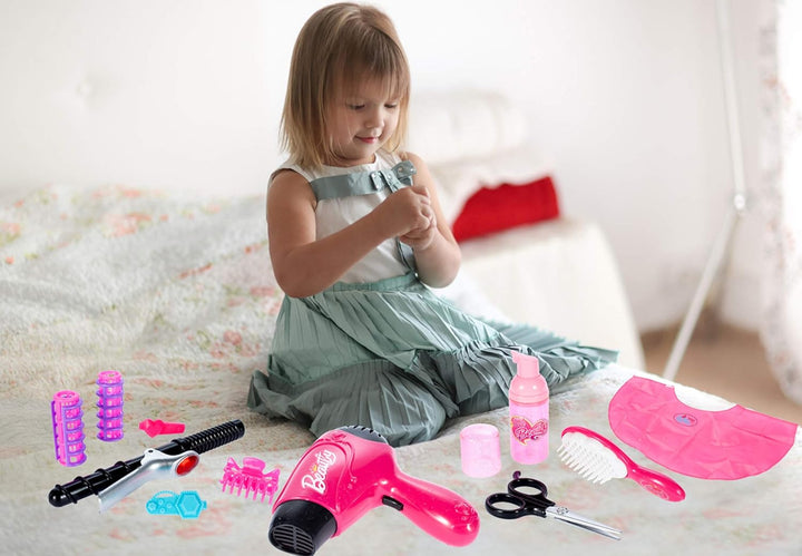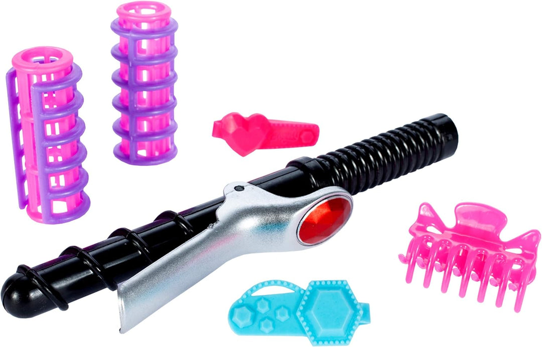 - 🎲 Das Set enthält eine Vielzahl von Zubehör, die Ihr Kind lieben wird! Ein Spielzeug Lockenstab, eine Spielzeugschere, ein Kamm, eine Spielzeugsprühflasche und vieles mehr.