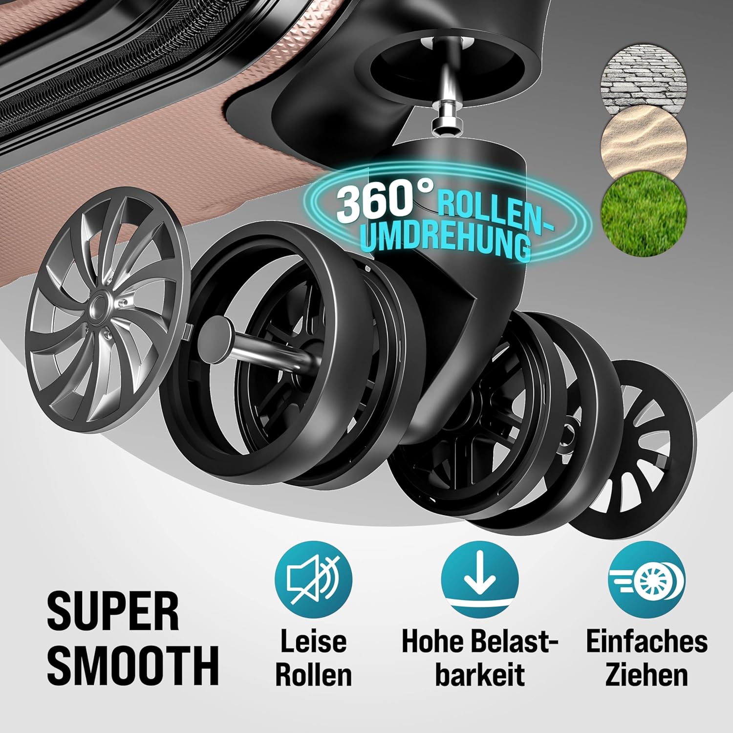 - VOLL BEWEGLICH UND MOBIL: Hohe Robustheit und niedriges Gewicht zeichnet diese Koffer aus. Mit 4 geräuscharmen Rollen mit PU Beschichtung (360° drehbar), robusten Alu Teleskopgriffen und den Gel-Griffen, lassen sich die Koffer komfortabel bewegen.