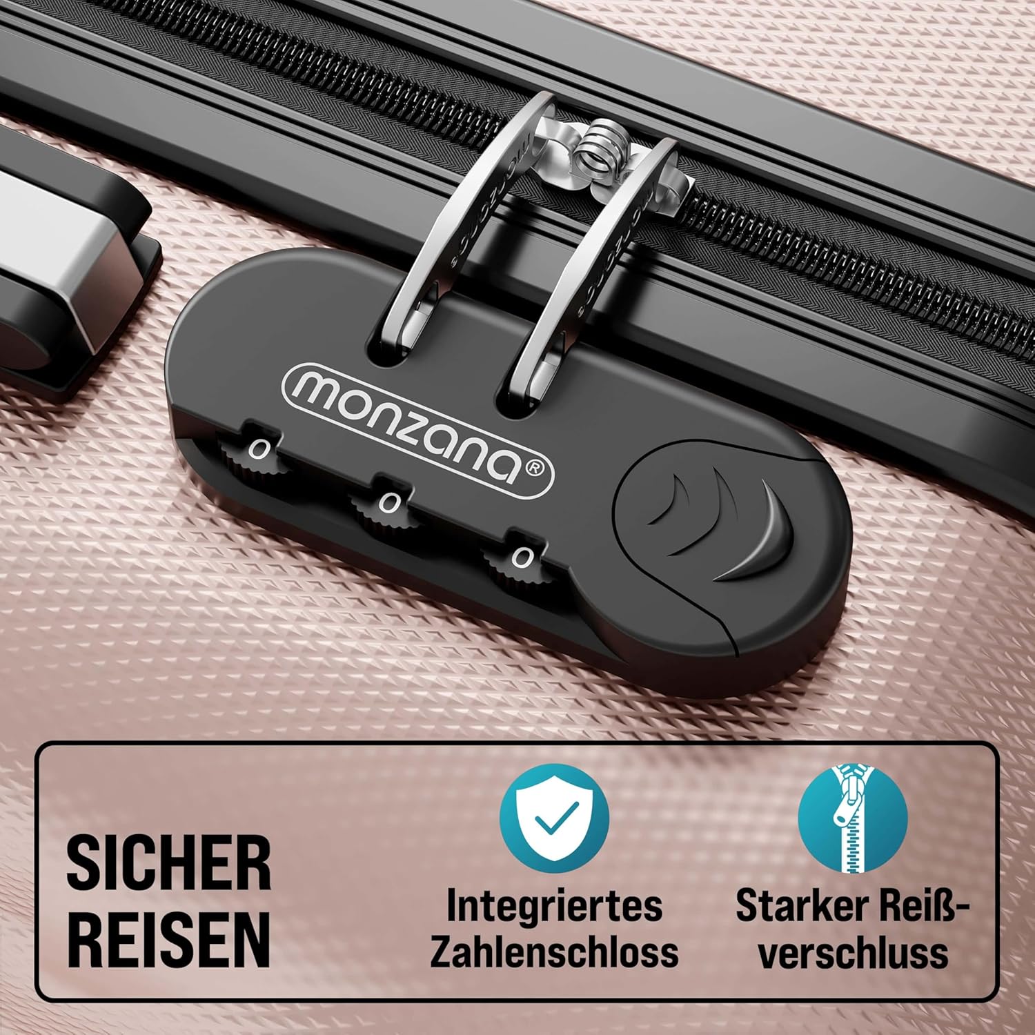 - DIE REISE KANN BEGINNEN: Die rosegoldenen Hartschalenkoffer von Monzana mit hochflexibler, schlagfester ABS-Kunststoffschale sind die perfekten Reisebegleiter. Das 4 teilige Kofferset bietet hohen Wert durch grosses Volumen und tolle Extras.