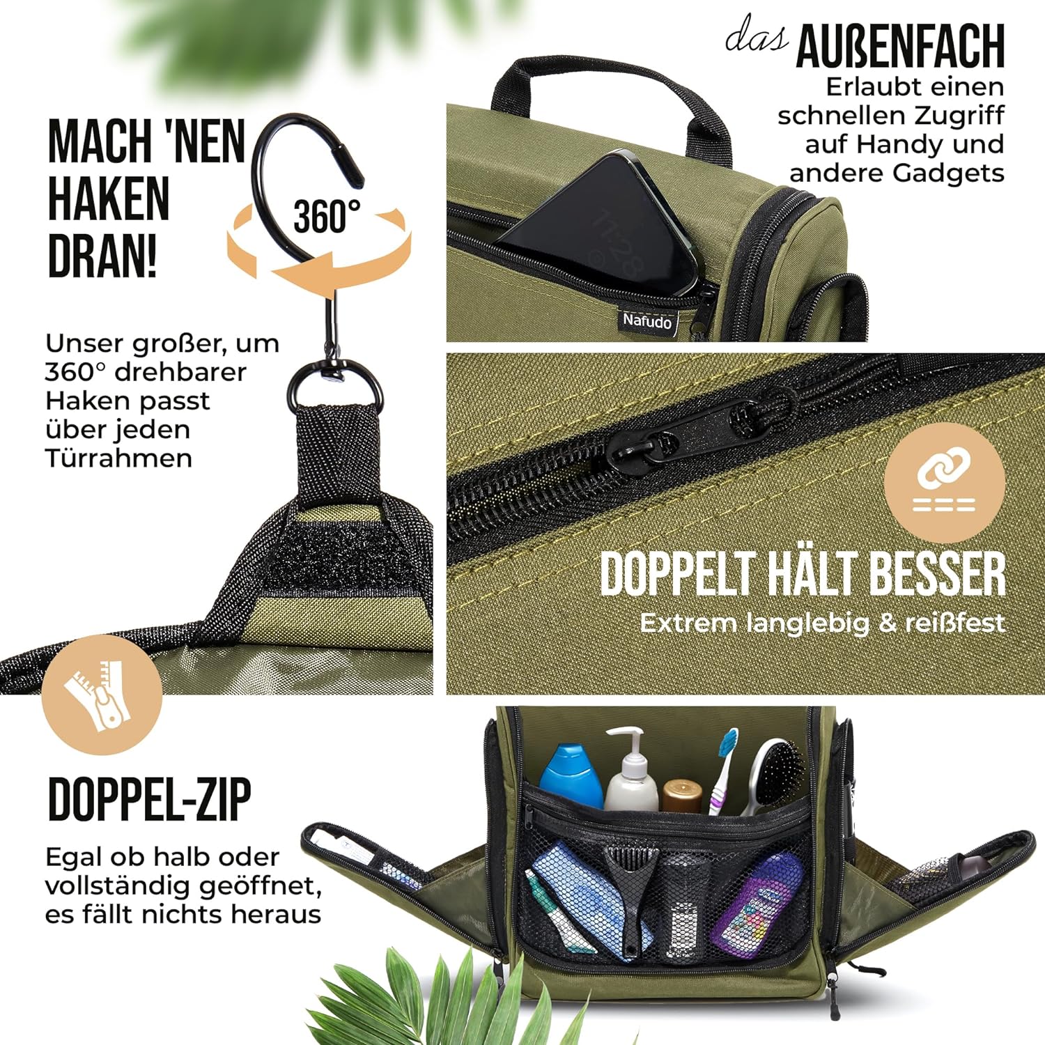 - DOPPELT HÄLT BESSER - Neben grossen und kleinen aufgeteilten Innenfächern punktet die Nafudo Kosmetiktasche auch durch ein Aussenfach mit Doppel-Zip. Ein Band auf der Rückseite kann sowohl als Handtuchhalter als auch zur Befestigung am Koffer dienen.