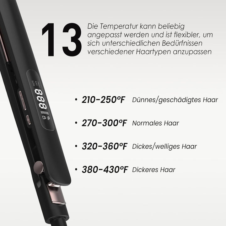- √【Einstellbare mehrere Temperatureinstellungen, geeignet für alle Haartypen】NOVUS Glätteisen eignet sich für alle Haartypen unter 13 einstellbaren Temperatureinstellungen von 210℉ bis 430℉ mit der LED angezeigt. Dieses heisse Werkzeug kann