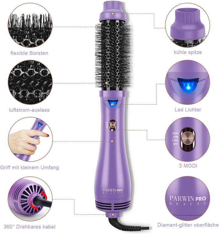 - 3 MODI --- 1000 Watt Föhnbürste, Schnelles Trocknen & Stylen. Wählen Sie aus 3 Heiz- und 2 Gebläsestufen die geeignete Einstellung für Ihren Haartypen. Wählen Sie die Einstellung HIGH für dicke oder widerspenstige Haare und die Einstellung LOW