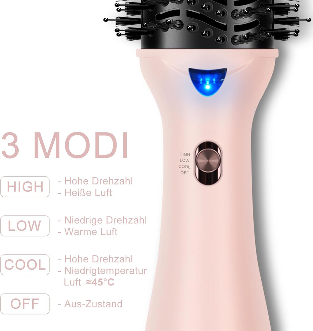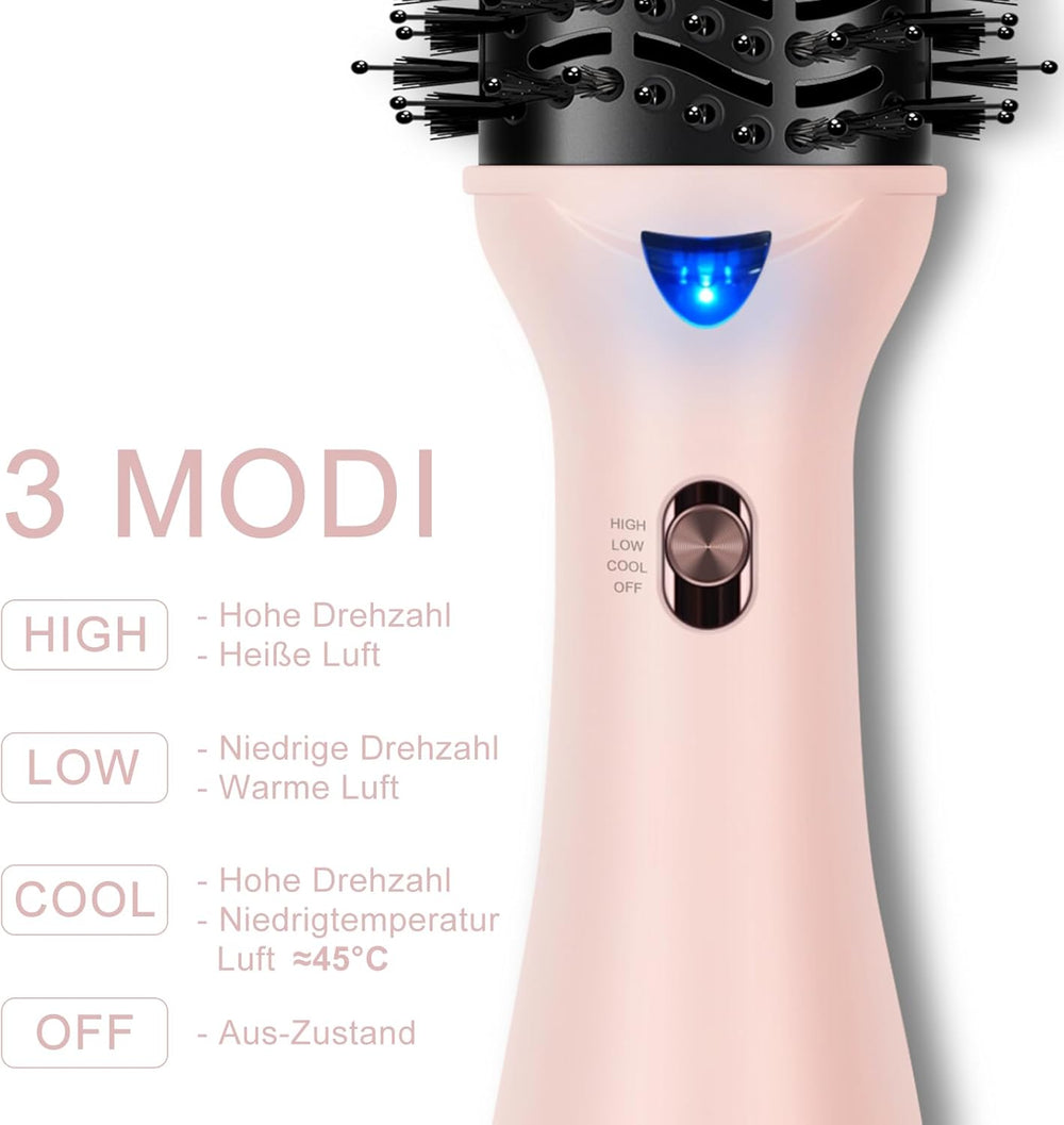 - 3 MODI --- 1000 Watt Föhnbürste, Schnelles Trocknen & Stylen. Wählen Sie aus 3 Heiz- und 2 Gebläsestufen die geeignete Einstellung für Ihren Haartypen. Wählen Sie die Einstellung HIGH für dicke oder widerspenstige Haare und die Einstellung LOW