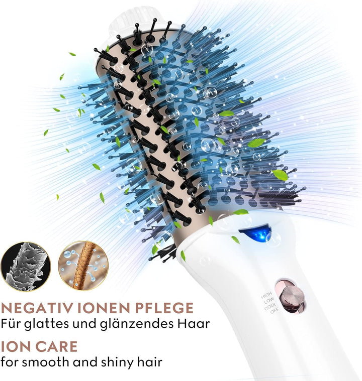 - IONEN PFLEGE --- Warmluftbürste mit Negativ-Ionen-Technologie, Eingebauter Ionengenerator setzt negative Ionen frei, Wirkt aktiv statischer Aufladung entgegen durch Anti-Frizz Effekt und sorgt für extra Glanz. Reduziert die statische Aufladung des
