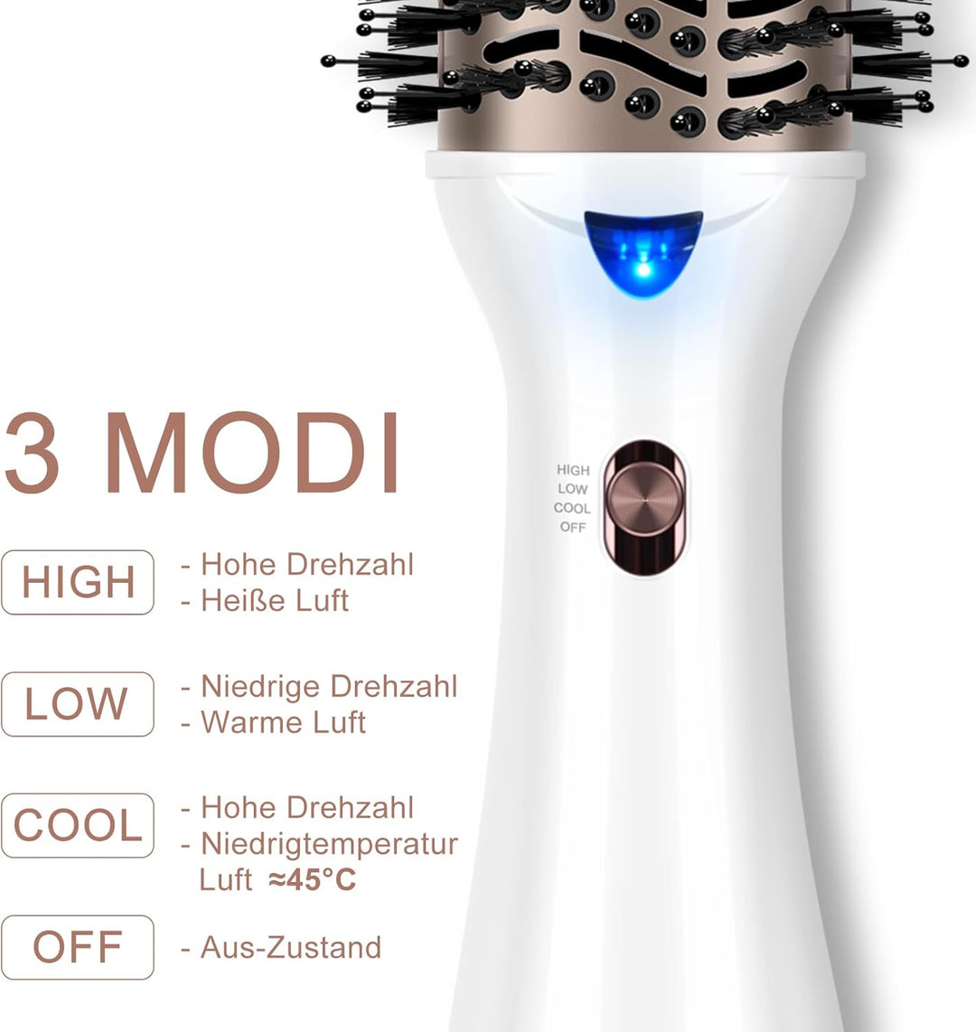 - 3 MODI --- 1000 Watt Föhnbürste, Schnelles Trocknen & Stylen. Wählen Sie aus 3 Heiz- und 2 Gebläsestufen die geeignete Einstellung für Ihren Haartypen. Wählen Sie die Einstellung HIGH für dicke oder widerspenstige Haare und die Einstellung LOW