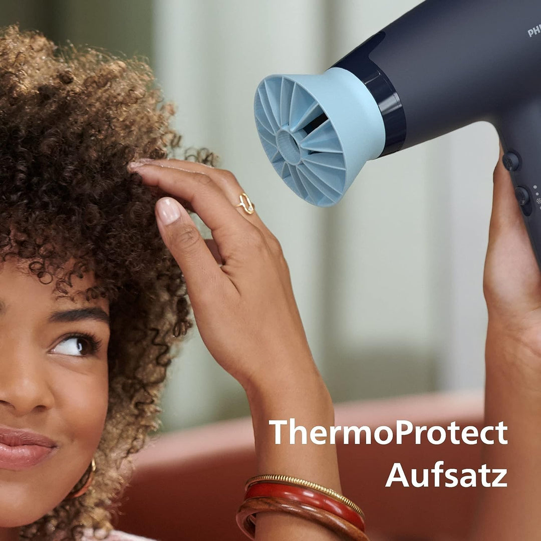 - Tägliche Pflege: Der mitgelieferte ThermoProtect Aufsatz mischt warme und kühle Luft und senkt so die Temperatur um 15 Grad, während Ihre Haar schnell getrocknet werden