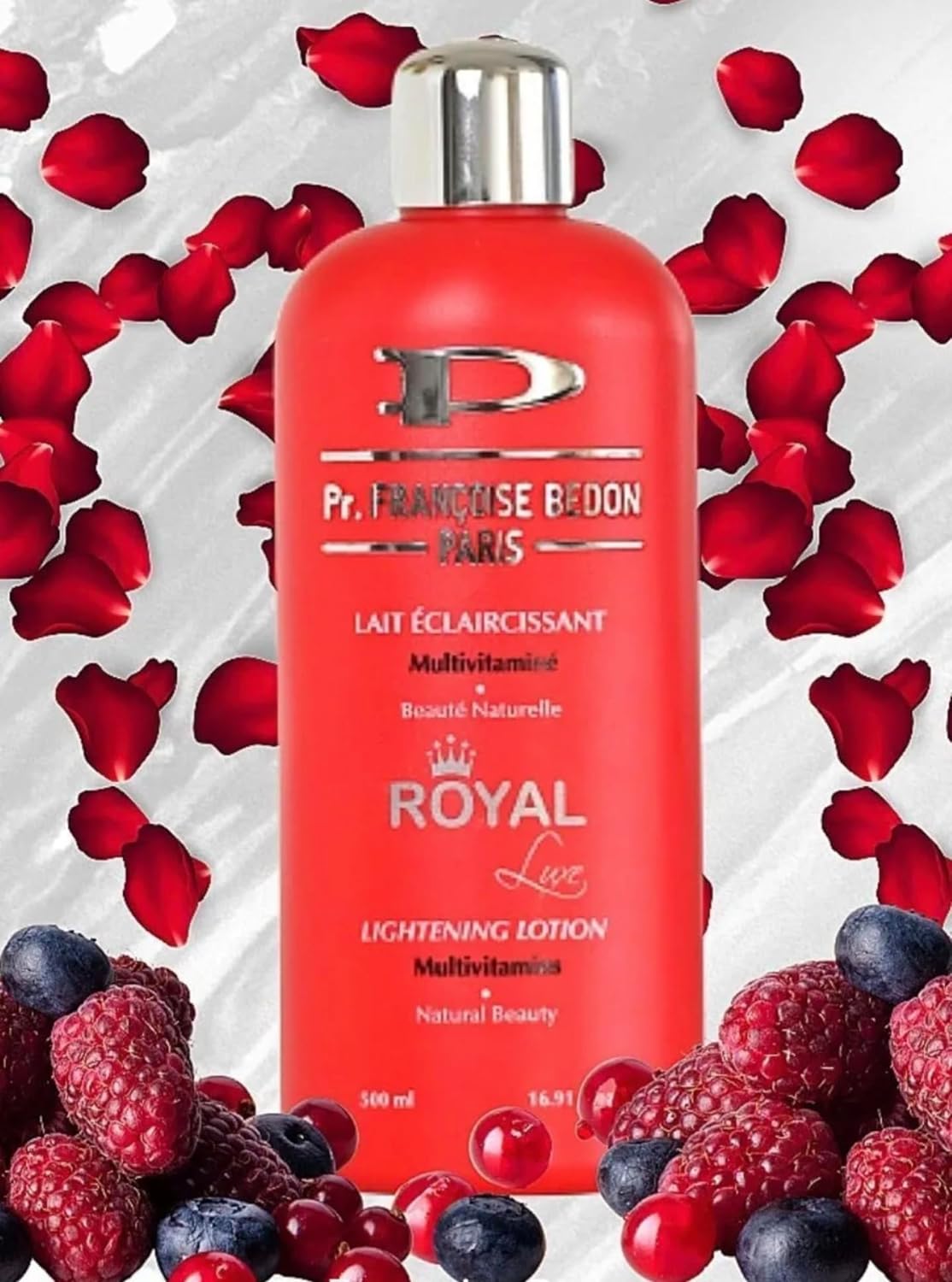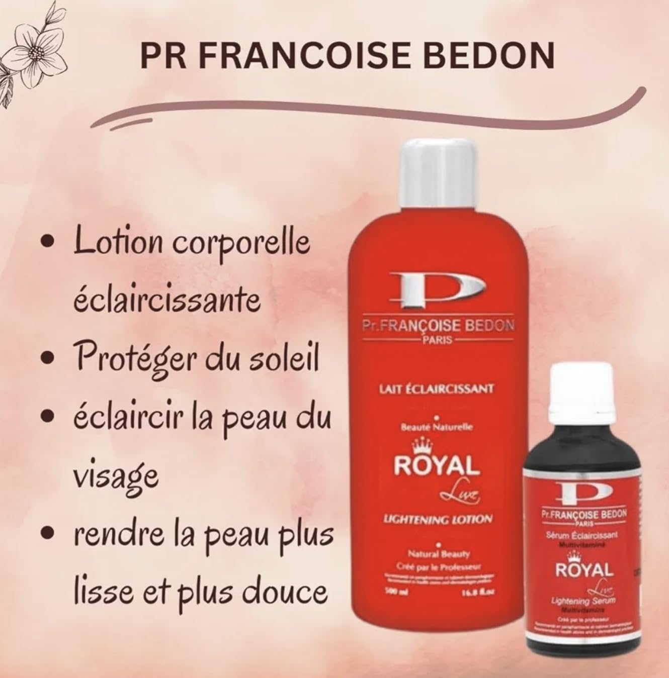 - Professor Francoise Bedon ROYAL Körperlotion, die speziell an schwarze und Halbkastenhäute angepasst ist, wird von ihren 100% natürlichen Pflanzen und Multivitaminen durchgeführt. Diese Formel behandelt und hilft, Narben und Flecken wie durch