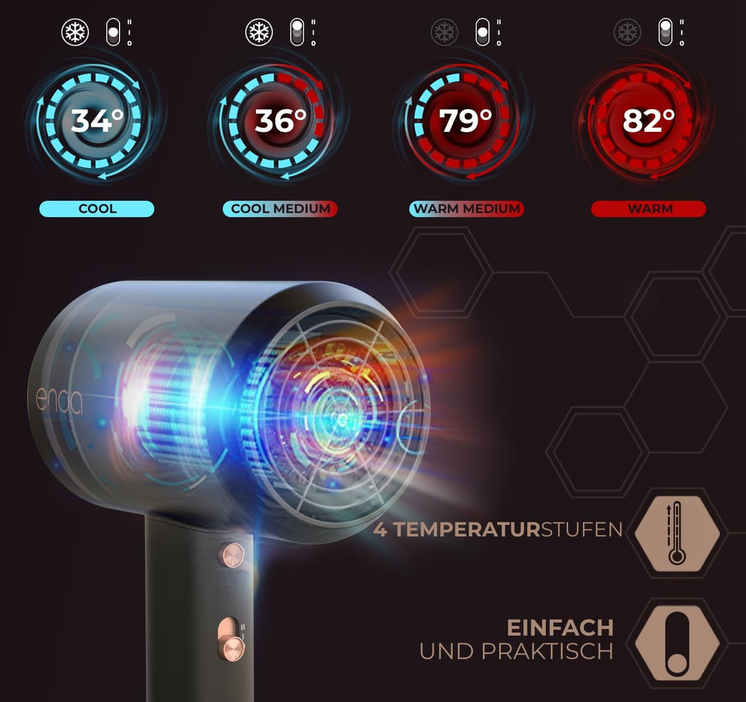 - ✅ 2 TEMPERATUREN UND 2 GESCHWINDIGKEITEN. Professioneller Haartrockner mit 4 verschiedenen Luftstrom- und Temperaturkombinationen: Kaltluft und niedrige Leistung, Kaltluft und hohe Leistung, Heissluft und niedrige Leistung, Heissluft und hohe Leistung,