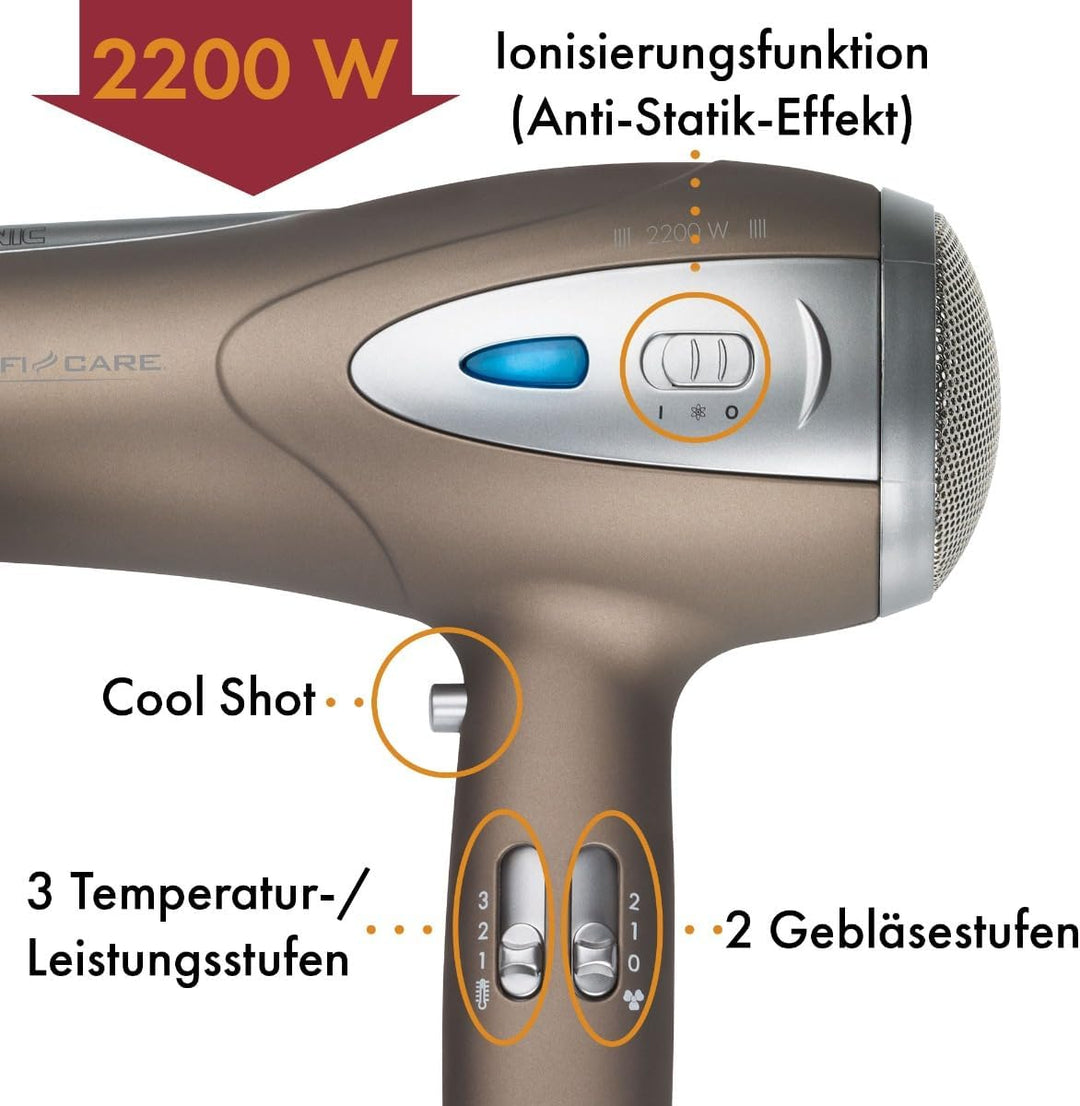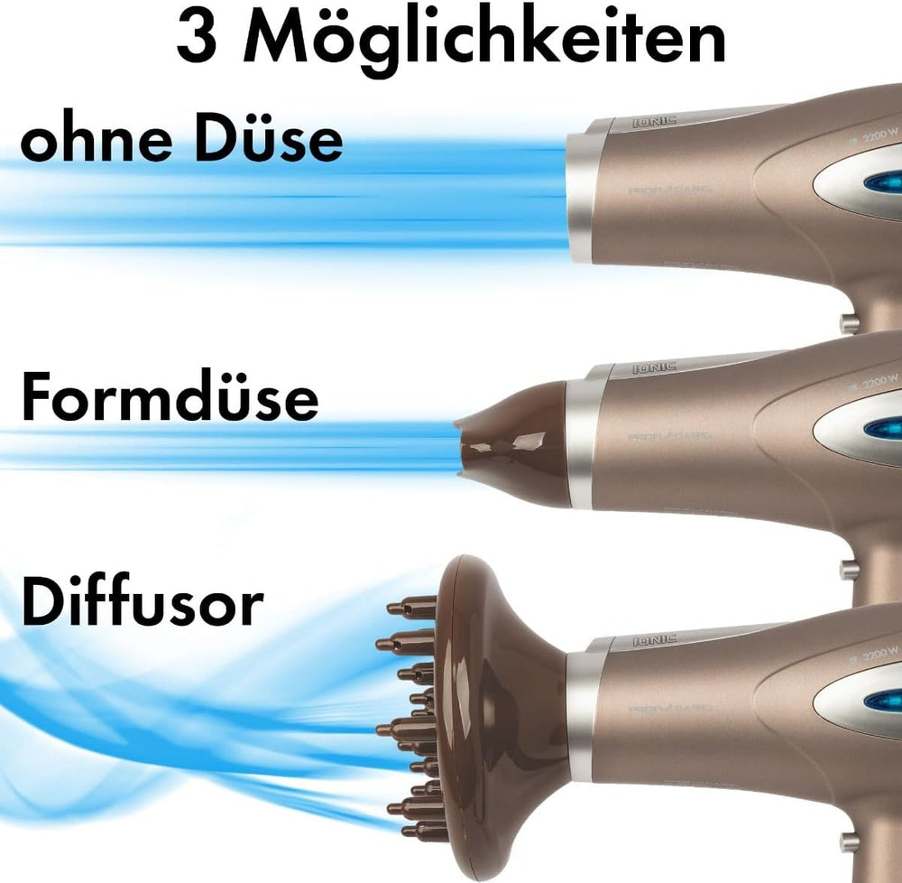 - Verwöhnen Sie Ihr Haar: Erleben Sie professionelle Pflege mit unserem 2200-Watt-Haartrockner, der eine Ionisierungsfunktion bietet, um Ihr Haar vor statischer Aufladung zu schützen, geschmeidig zu machen und ihm einen unwiderstehlichen Glanz zu