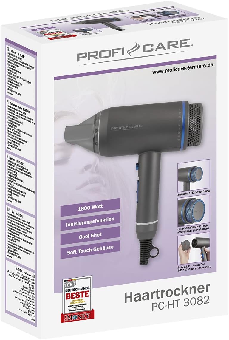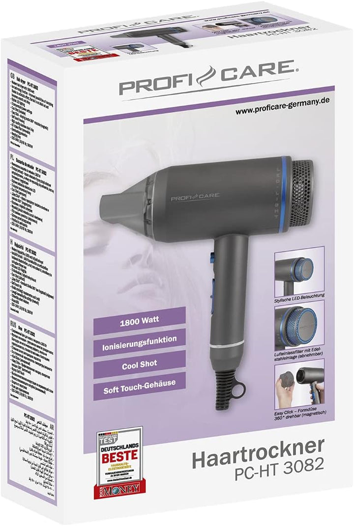 - Top gestylt — Mit dem kompakten PC-HT 3082 von ProfiCare mit stylischer LED-Beleuchtung erhalten Sie einen leistungsstarken und modernen Haartrockner, der schonend Ihre Haare trocknet und pflegt.