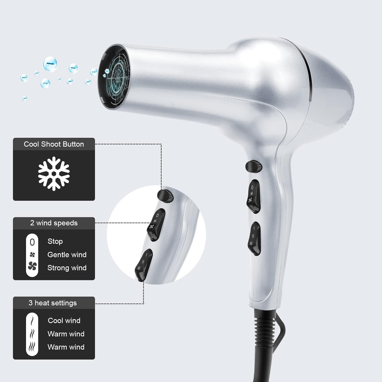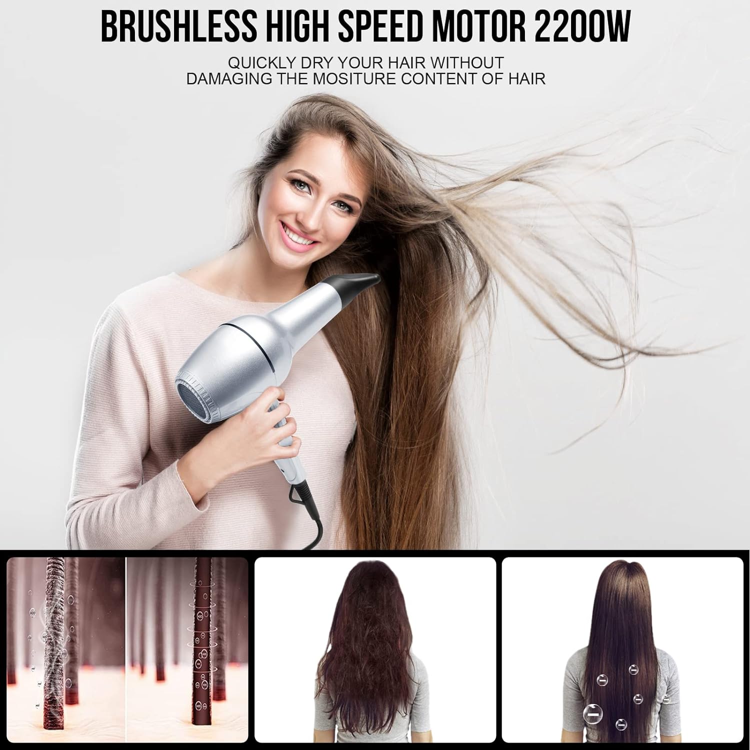 - 🔥【Geschwindigkeit und Leistung】 Der Haartrockner hat eine Leistung von 2200W und einen leistungsstarken AC-Motor, um Haare schnell zu trocknen und zu stylen; der langlebige bürstenlose AC-Motor.