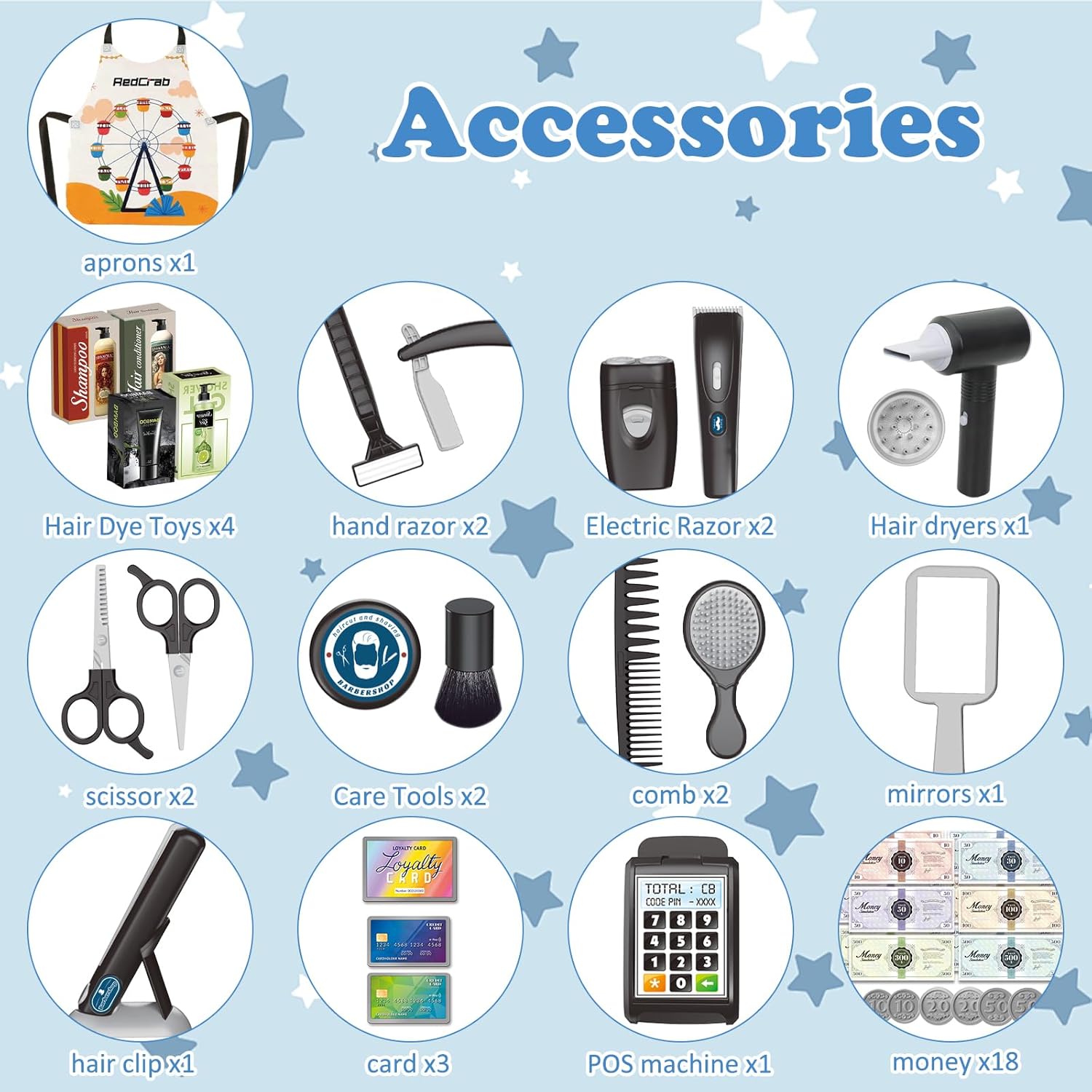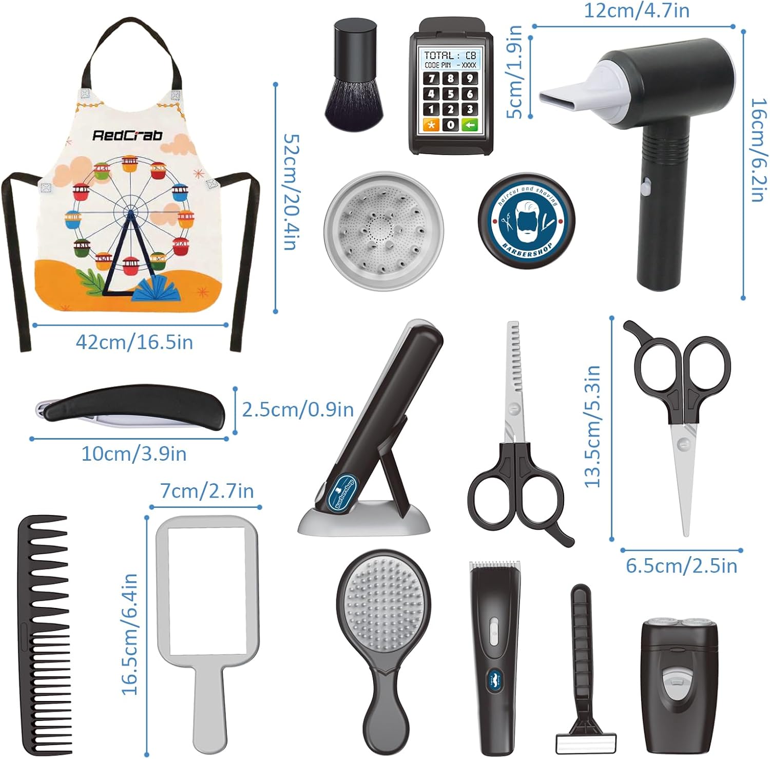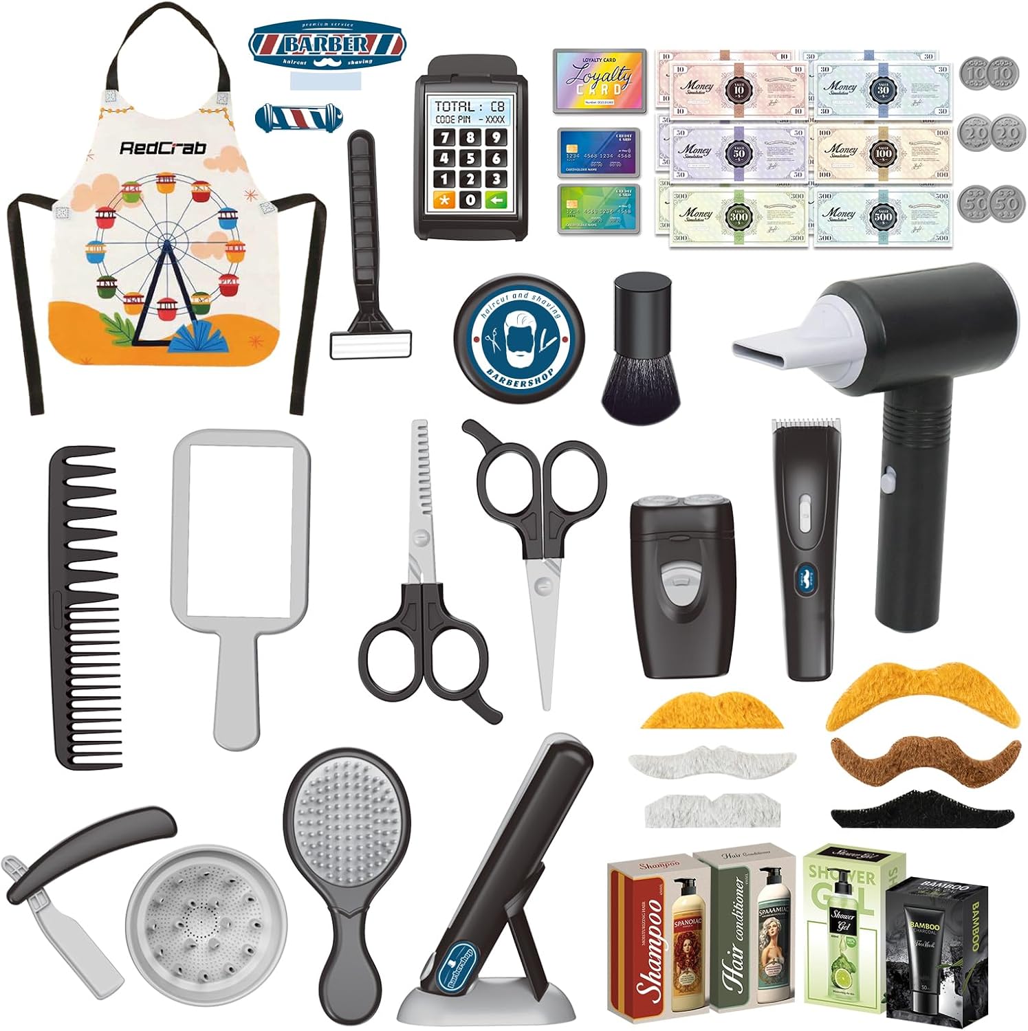 - Kinder Friseur Set: Dieses Friseurspielzeug für Kinder enthält Spielzeug-Rasierer, Föh mit Geräusch, Haarglätter, Spiegel, Kamm, Haarstylingscheren, Haarschnitt-Lätzchen, Friseurbedarf Spielzeug, Make-up-Pinseln, Falscher-Bart. Dazu gehören auch