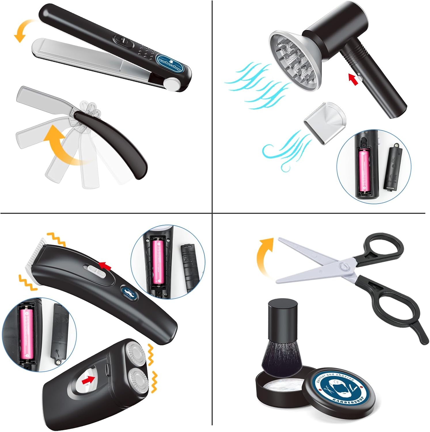 - Echte Funktion: Batteriebetriebener Föhn((Batterien nicht enthalten), auf Knopfdruck pustet der kleine Fön kalte Luft heraus und Geräusche macht, Elektrischer Rasierer mit realistischem Vibrationsgeräusch, bietet ein realistisches Gefühl. Kinder